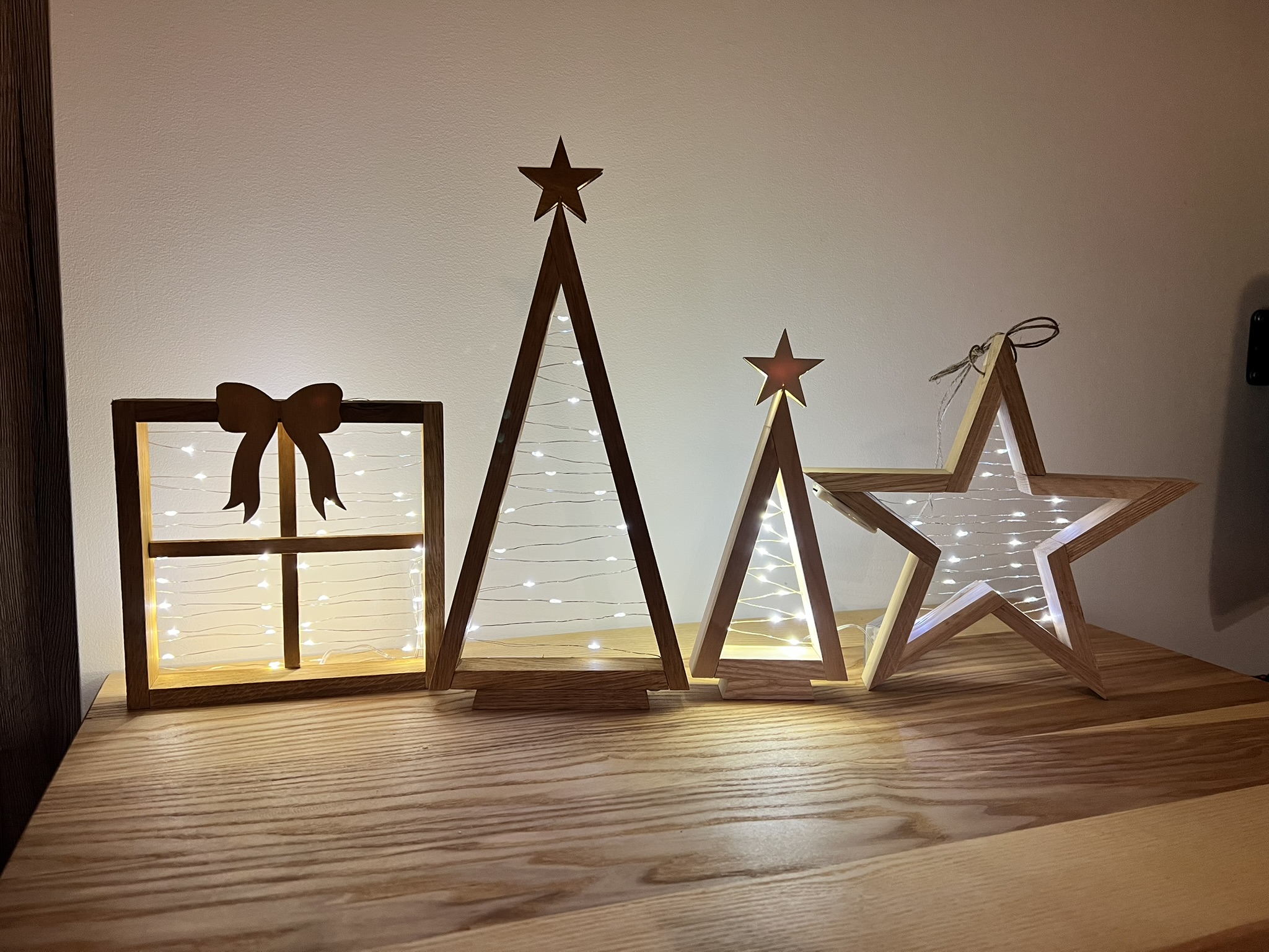 Vánoční dekorační dáreček z dubového dřeva a překližky ozdobený drátkovým světlem.