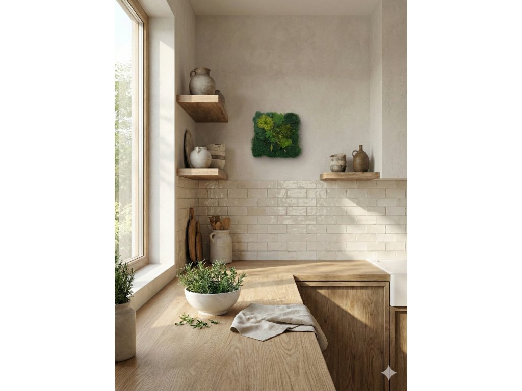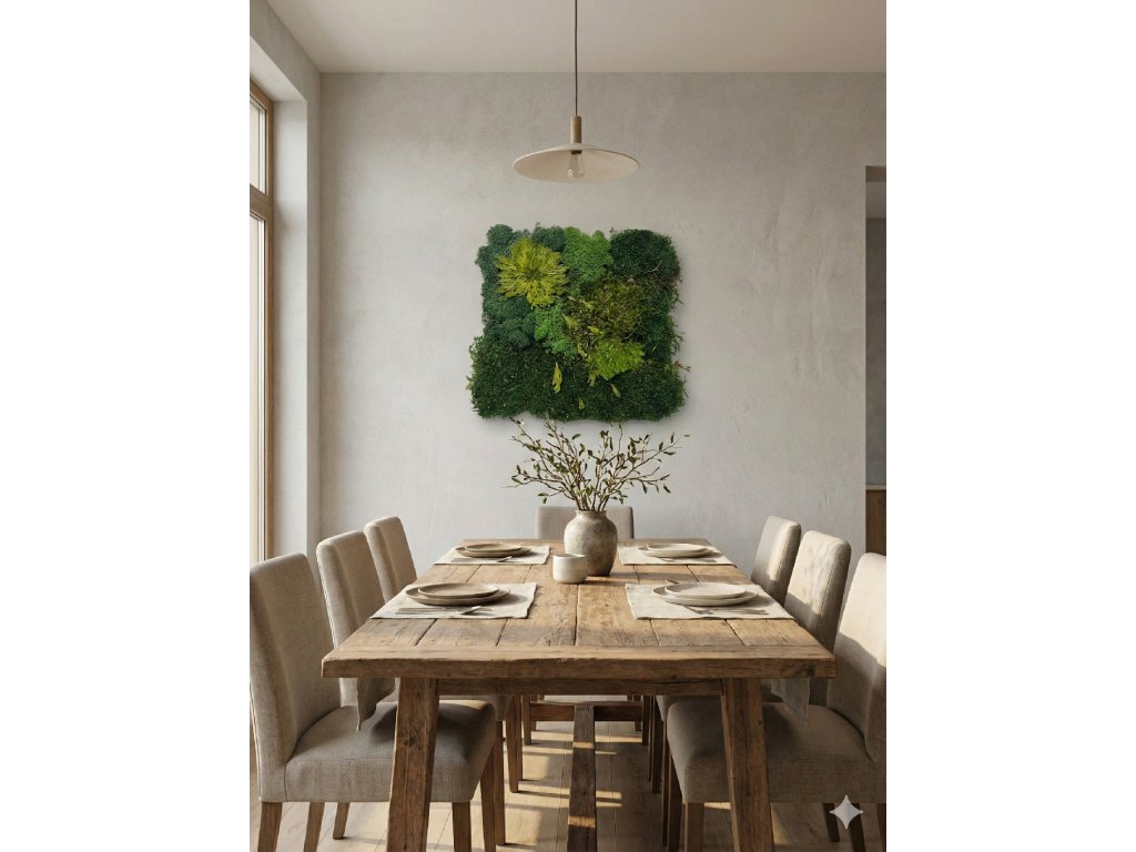 Autentický kousek divoké přírody u vás doma. Varianta FOREST v rozměru 30x30 cm zachycuje surovou krásu lesního podrostu. Kombinace plochého mechu, nadýchaných bochánků a dlouhých stébel lesních travin vytváří plastický obraz, který vypadá, jako byste jej právě vyřízli z lesní mýtiny.