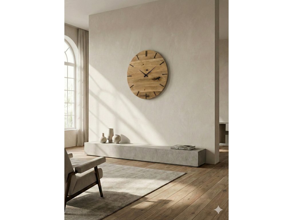 I přes svou velikost si hodiny zachovávají lehkost a eleganci. Masivní dubové dřevo z českých lesů v kombinaci s minimalistickými černými ručičkami vytváří nadčasový design, který se neokouká. Je to kus poctivé přírody, který dýchá a voní řemeslem.